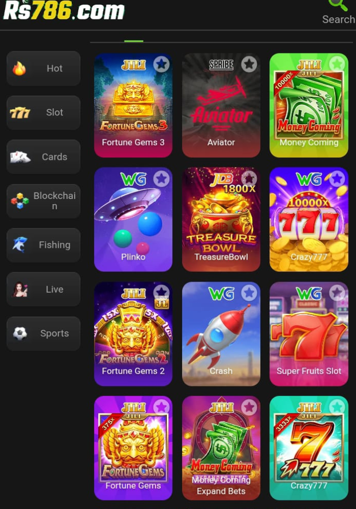RS786 APK is a new online gaming and earning app, especially popular in Pakistan. It offers a wide variety of trending casino-style games like Aviator, Fortune Gems, Slots, Poker, Rummy, Lottery, and Live Cricket Betting, giving users the chance to play and earn real money.