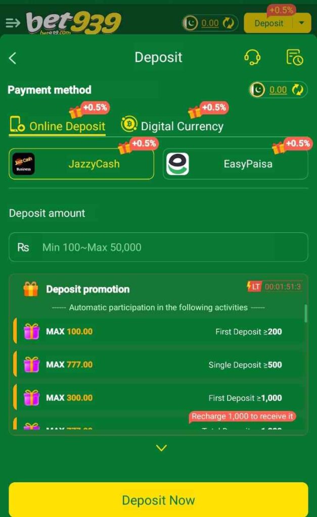 Bet939 online usually supports popular payment methods in Pakistan, such as Easypaisa, JazzCash, bank transfer, and sometimes other online wallets. Select the method most convenient for you.