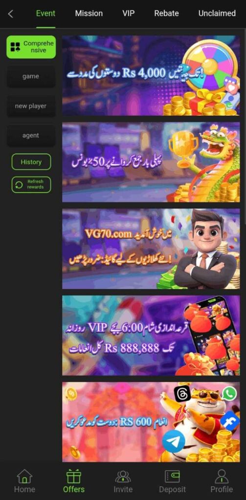 Both you and your friend benefit, which makes the game more social and profitable. Seasonal promotions and special events bring bigger prizes. Players can join tournaments, complete missions, or play lucky draws to win cash. With these offers, the VG70 earning app becomes more than just a game. It creates opportunities to earn consistently while enjoying casino, slots, and sports betting in Pakistan.