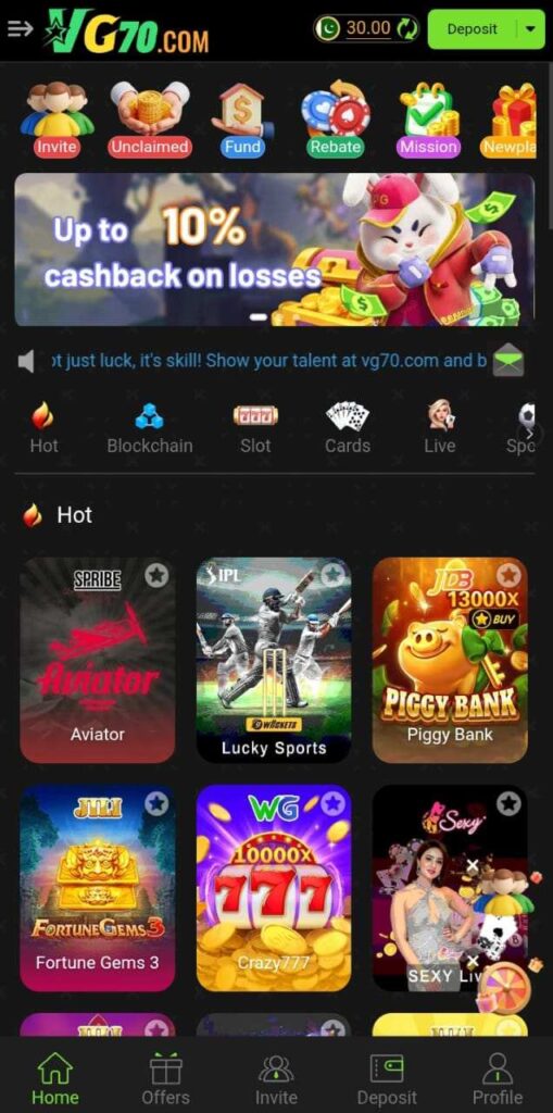Open the VG70 earning app, create your account, and start enjoying casino, cards, slots, lottery, and sports betting.